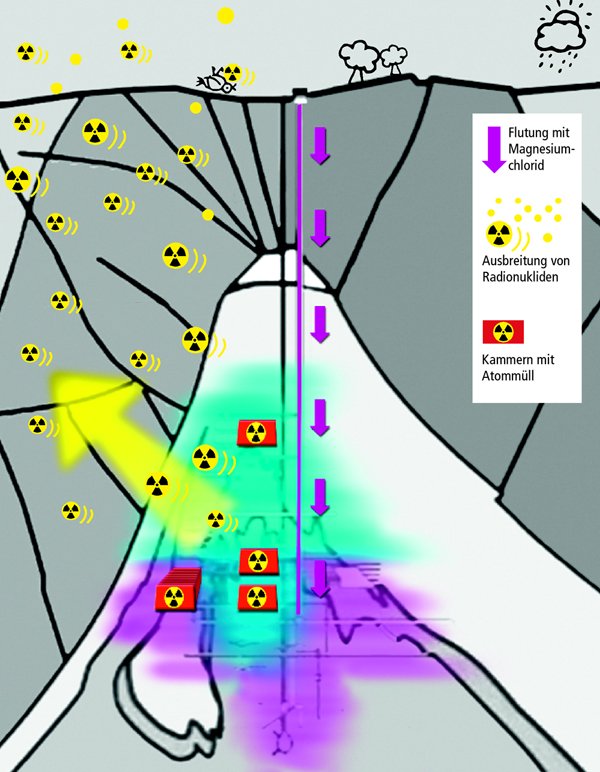 Bei einer Flutung der Asse würde es in unbekannten Zeiträumen an unbekannten Orten in Norddeutschland zu einer Freisetzung von Radioaktivität in unbekanntem Ausmaß kommen! Nach einem "Strömungs- und Transportmodell" von Dr. Ralf Krupp aus dem Jahr 2010 wird dies innerhalb weniger Jahre geschehen.